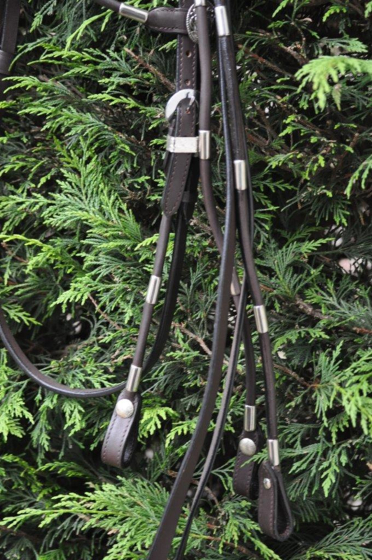 Westernhoofdstel met zilverbeslag, rondgestikte delen met 187 cm teugel.